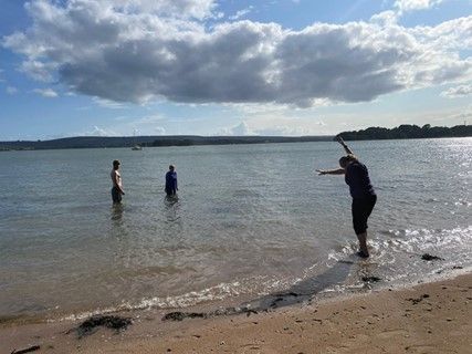 Saturday started wet, but didn’t dampen our spirits. Some of us took advantage of the Squirrel Shuttle, an electric bus which provided a guided tour of the island for less mobile visitors whilst others chose to walk and explore more of that experimental campsite, the old Pottery and its pier as well as the calm of Cambridge woods on the north side of the island. As the sun came out in the afternoon, we took full advantage of our beach access for a refreshing swim in the sea even though some people took a dive into the briny sooner than they expected to do!