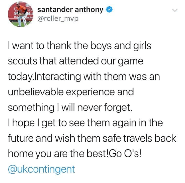 The combined UK Contingent hit the headlines for befriending the Orioles' left-filder Anthony Santander after he threw them some baseballs.