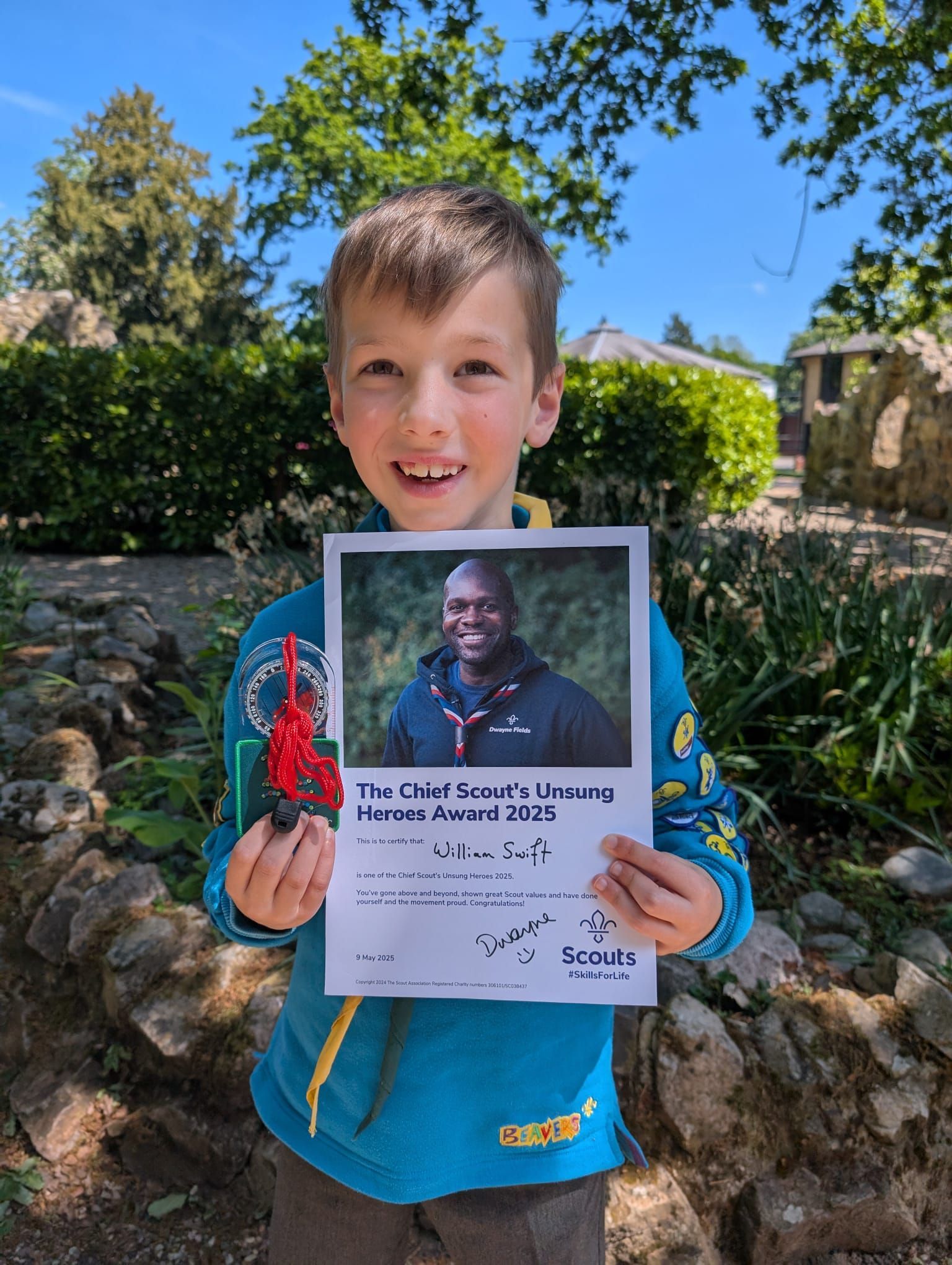 ‘William’s older sister Evelyn (7th Scout) sadly passed away in April 2022, when he was four. His parents established Evelyn’s Butterfly Effect to spread random acts of kindness in Evelyn’s memory, and William has been actively involved throughout.